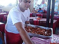 This restaurant by the sea in Ponta Negra serves shrimp by the system of rodizio: for a flat price, customers can eat as much as they like (in September of 2006, price was R$ 19.90 per person; prices can change during high season); waiters go around the restaurant carrying different options of shrimp, and serve small portions to customers.